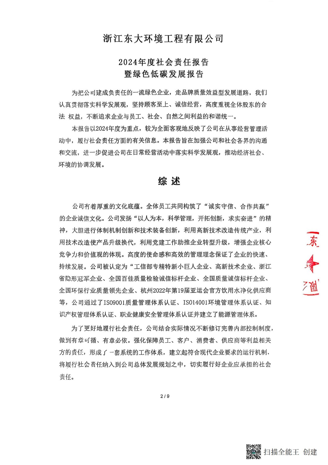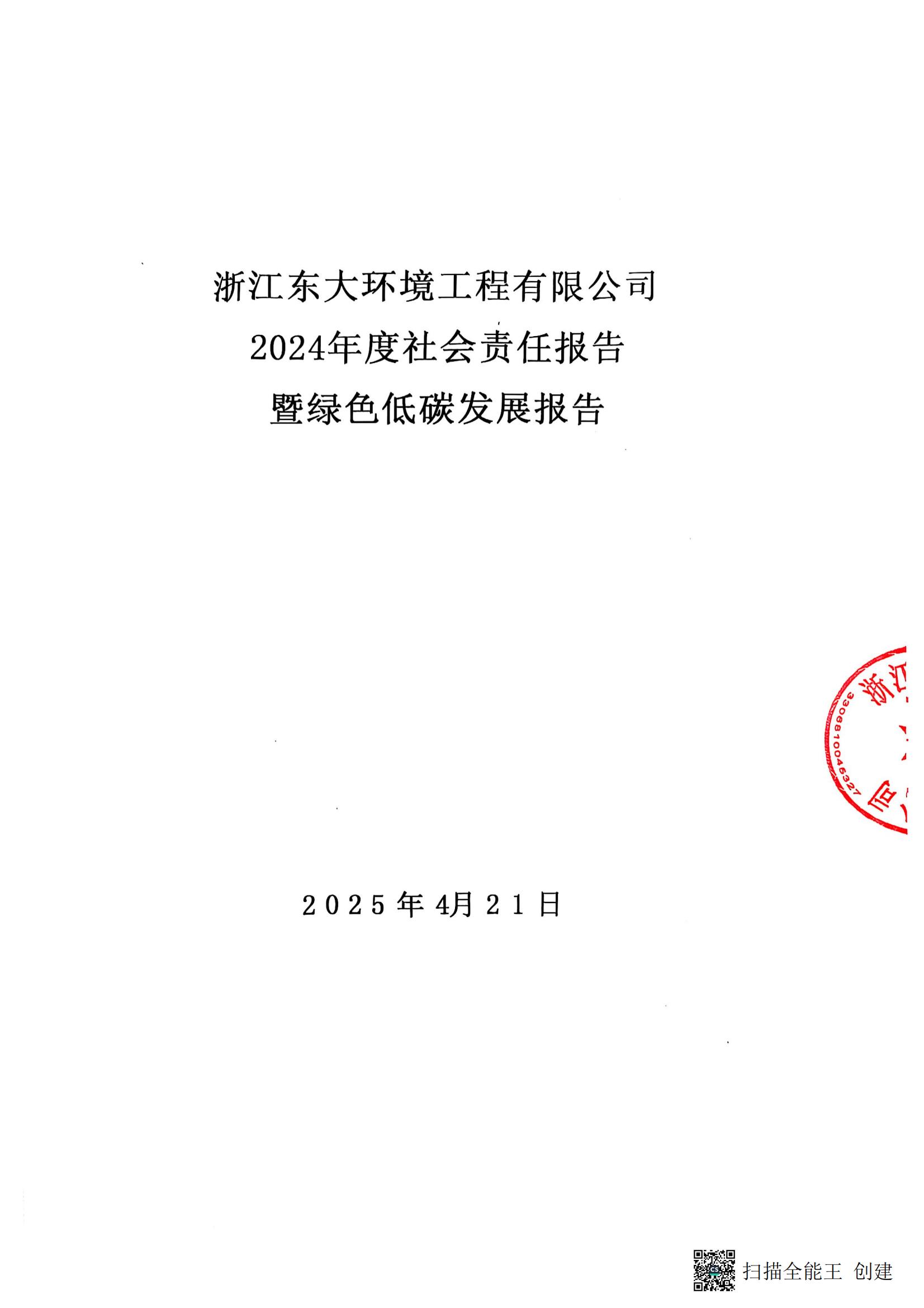 浙江東大環境工程有限公司2024年度社會責任報告暨綠色低碳發展報告